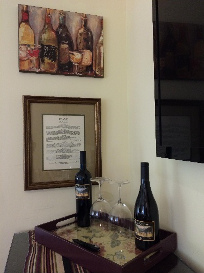To really give guests a sense of what Carmel Road Winery has to offer, in the room they will find a selection of Carmel Road wines for purchase, information about their wine club as well as the winery, beautiful etched glasses, stone coasters, plush throw blankets, and complimentary tasting cards for up to four people.